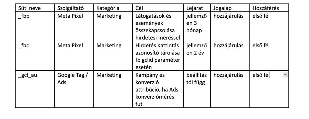 Amennyiben a szolgáltató a weboldalon Meta Pixel, Google Ads vagy hasonló marketing mérést ténylegesen bevezet.